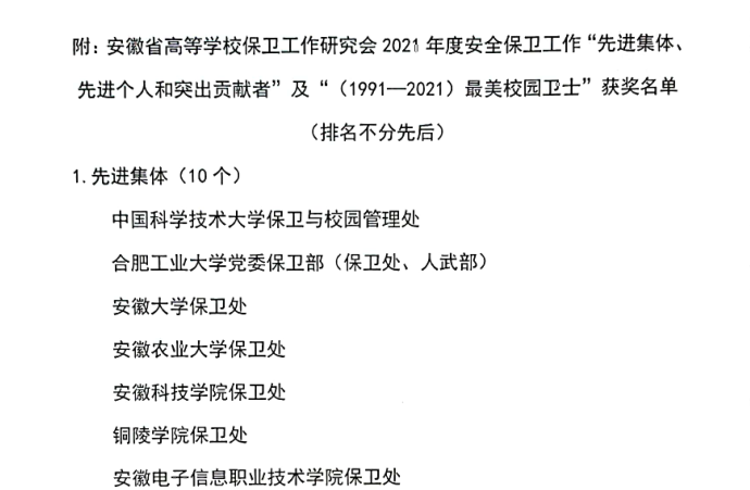 近日,安徽省高等学校保卫工作研究会印发了《关于表彰2021年度高校安全保卫工作“先进集体、先进个人和突出贡献者”及“最美校园卫士”的决定》,我校保卫处获评安徽省高等学校2021年度“先进集体”荣誉称号。