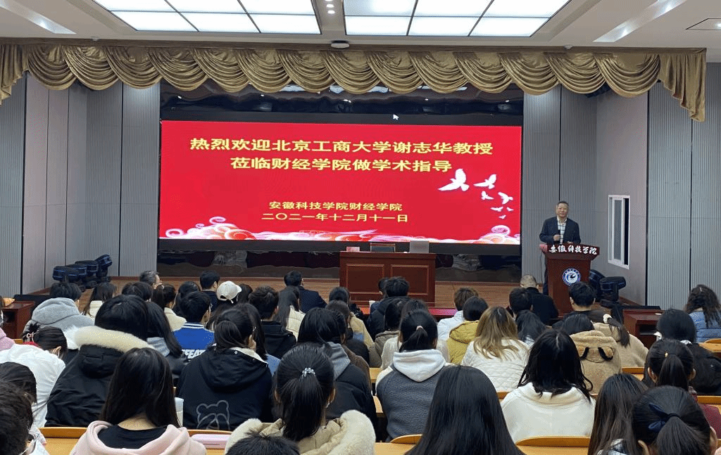 2021年12月11日上午,北京工商大学原副校长、现任教育部工商管理学科指导委员会副主任委员谢志华教授应邀莅临我校财经学院指导新商科专业建设,安徽财经大学会计学院院长翟胜宝教授随行指导。谢志华在敏行楼A一楼报告厅做了题为“新技术与新商科”的学术讲座,华体平台党委委员、副校长黄友锐、教务处处长赵伟峰、财经学院党政领导和全体教职工以及2021级会计学、2021级金融工程专业学生参加报告会。财经学院院长郝世绵主持报告会。