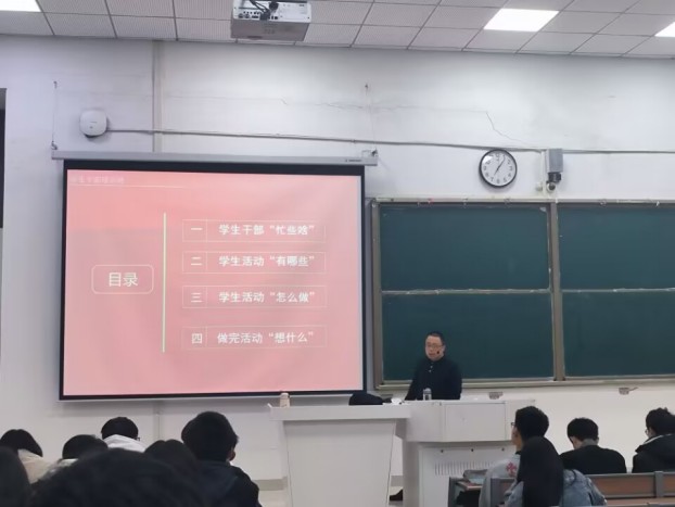 讲座从“学生干部忙什么”“学生活动有哪些”“学生活动怎么做”“做完活动想什么”四个版块展开。他指出,学生干部作为联系师生的桥梁,要善谋划、强协调、重创新、抓落实。耿广汉将学生活动划分为“理想信念教育”“思想道德教育”“学风考风建设”等十三大类,并结合实际,畅谈活动策划如何与时俱进,方案内容如何集思广益,组织活动如何多角度宣传,实施过程如何因势而变,总结活动如何得失兼顾等方面心得体会。他希望广大学生干部做到“内外兼修”,要以主动积极创造的态度,守住忠实心、平常心和耐受心,高标准、高要求、高效率落实工作任务,在学习工作实践中,练就过硬的本领,真正成为广大同学身边的旗帜、榜样和表率。