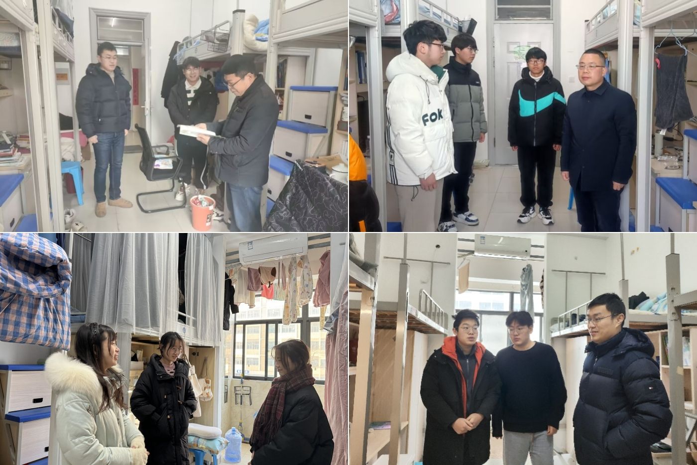 走访期间,学院领导及辅导员和学生亲切交谈,耐心询问同学们思想状态、寒假经历、学习情况等,提醒学生注意防寒保暖、用电安全、防诈防盗、个人健康等,强调宿舍管理规定,加强创建“文明宿舍”,引导学生在新学期合理规划时间,养成良好习惯,勤于学习,勇于创新,全面发展,成长成才,乘势而上,再攀新高。