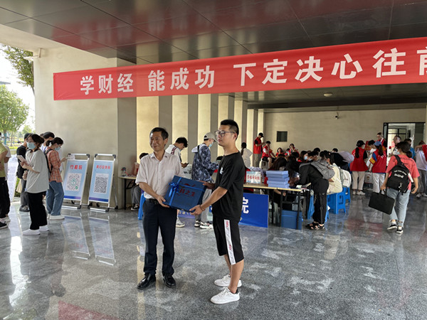 9月16日,校领导李震、黄远友、王强、黄友锐、李升和在相关职能部门负责人陪同下,深入财经学院迎新报到点,看望并慰问2021级新生。国家一流本科专业财务管理专业文科最高分的李磊同学在报到现场收到了校长李震亲手赠送的慰问大礼包。