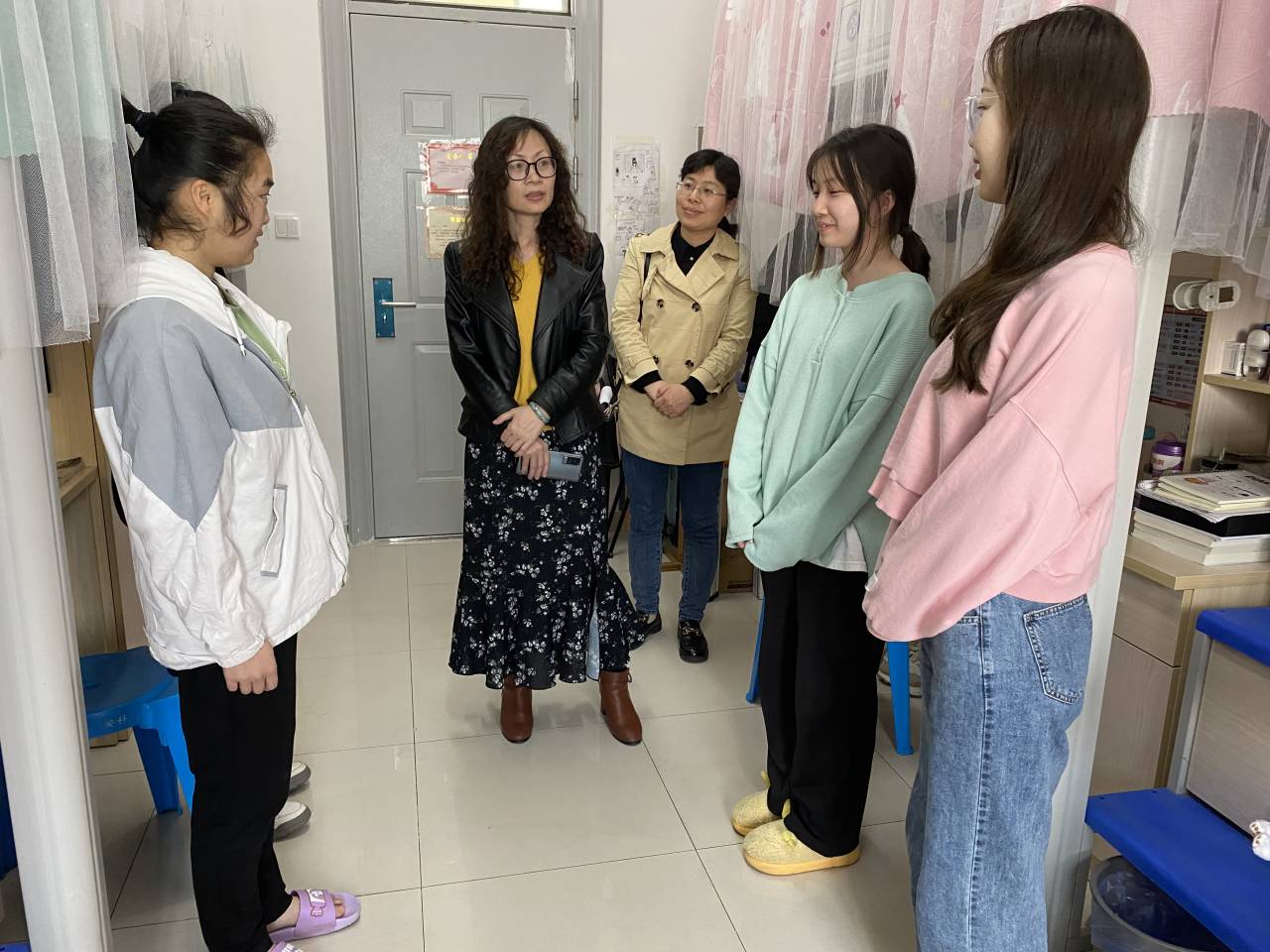 走访过程中,领导老师与学生亲切交谈,了解学生的清明假期的活动安排和疫情期间的生活学习。叮嘱学生要严格按照学校防疫工作通知要求,及时关注学校防疫工作动态,配合学校做好相关防疫工作。提醒同学们做好自身体晨午检工作,保持宿舍干净卫生,注意个人防护。