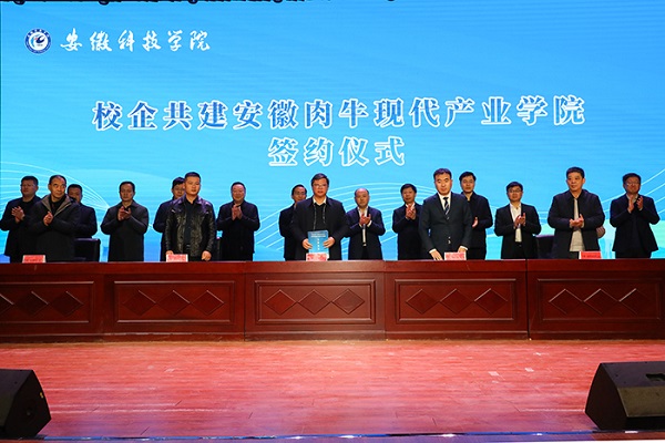 我校党委委员、副院长李升和代表学校与安徽欣浩翔食品有限公司、淮南市犇牛特畜牧养殖有限公司、安徽宝临食品有限公司、凤阳县大明农牧科技有限公司签署校企共建安徽肉牛现代产业学院协议。