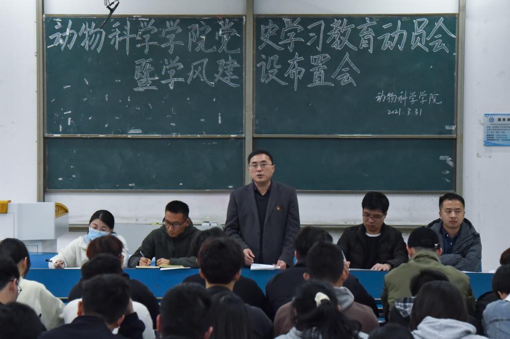 为切实抓好党史学习教育工作,促进学院优良学风形成,3月31日下午,动物科学学院在新知楼B101组织召开党史学习教育动员会暨学风建设工作布置会。动物科学学院党委书记姚勇,党委副书记汤帅,党委委员、副院长贺绍君,团委书记李焱,辅导员胡文丽出席会议。动物科学学院各班班长、团支书、学习委员,部分学生干部,全体学生党员参加会议。会议由贺绍君主持。