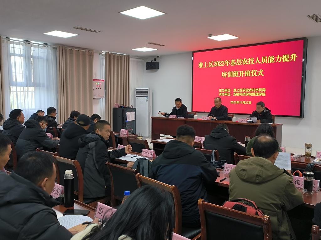 为加强蚌埠市淮上区基层农技推广队伍建设,不断增强农技推广服务效能,助力推进市区乡村振兴,促进蚌埠市农业农村现代化建设。11月27日上午,由蚌埠市淮上区农业农村水利局主办、华体平台管理学院承办的“淮上区2023年基层农技人员能力提升培训班”在安徽小岗干部学院如期举行。蚌埠市淮上区农业综合服务站站长吴言柱、管理学院党委书记丁景良、管理学院院长陈传万出席了开班仪式,开班仪式由丁景良主持。