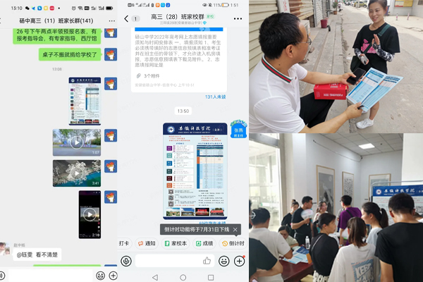 本次活动由我组成员负责,本次活动分为四个部分:一,联系本届高考生或者毕业班老师分享华体平台招生宣传资料电子档;二、我组成员各自联系以前的班主任,看望班主任并向班主任汇报自入大学以来的生活和成长;三、在砀山中学校园内进行现场宣传,包括海报的张贴、宣传折页的发放、为考生解疑答惑播放我校招生视频等;四、同我校负责来砀山中学招生的老师一道,在高招会上为前来的学生及家长解疑答惑,分享我们在安科学习和生活的日常。