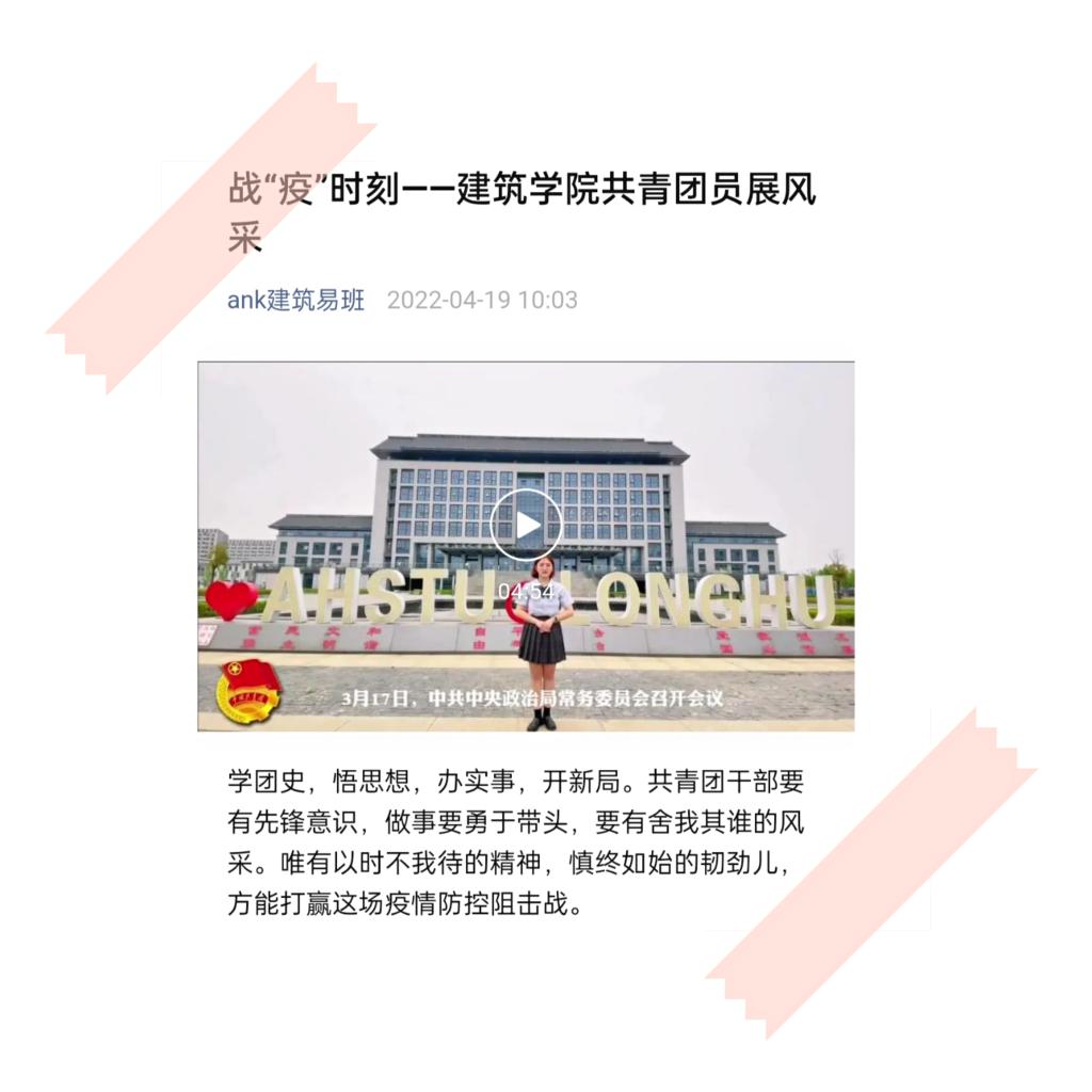 团支部录制的《战“疫”——共青团员的中坚》视频,充分体现了广大团员青年在疫情防控阻击战中贡献青春力量的热情和决心。视频中,张雨欣同学就当下疫情形势进行了系统地讲解,她号召全体共青团员要发挥党的助手和后备军作用,带领班级学生积极作为。罗志娟同学讲述了疫情防控期间建筑学院学子积极参加劳动实践、体育锻炼和文化活动,号召广大青年继续争当表率,以实际行动坚定战胜疫情的决心和勇气。该视频在华体平台建筑学院易班微信平台发布后,反响良好,得到师生一致好评。