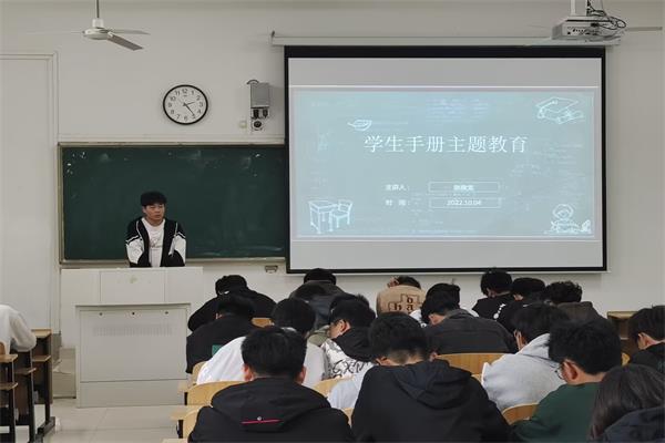 为加强新生校规校纪教育,提高新生自律意识和安全防范能力,10月4日至7日建筑学院分专业组织2022级新生集中学习《华体平台学生手册》,新生辅导员助理赵俊龙担任主讲。