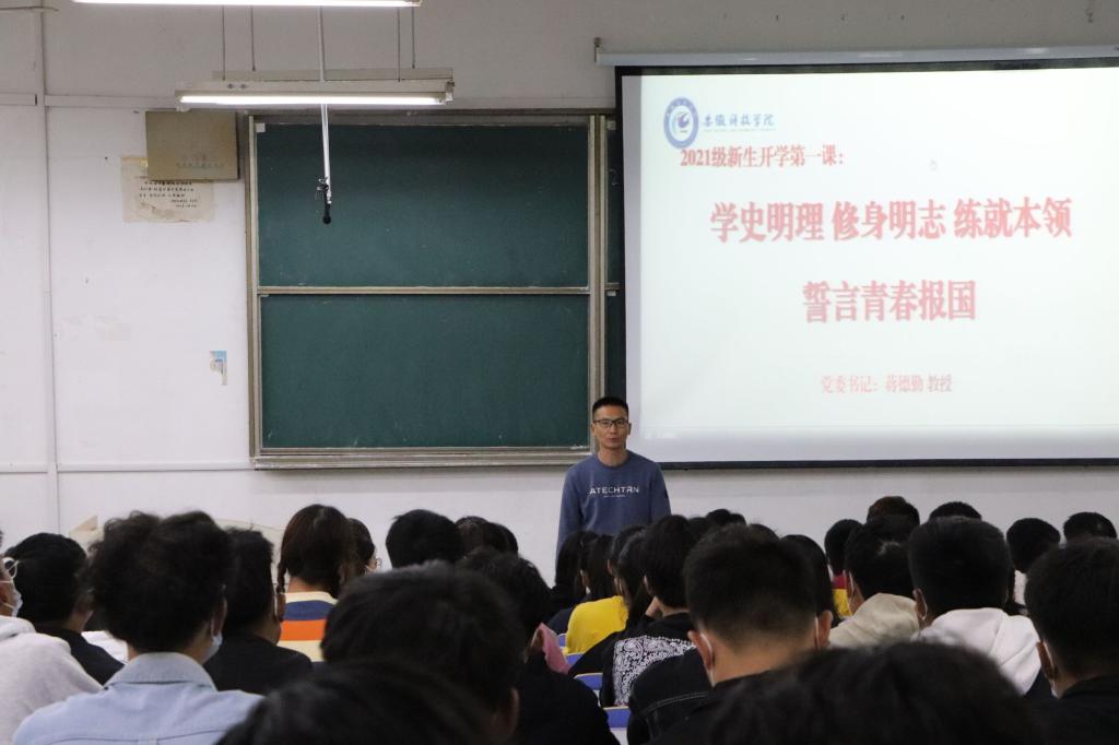 蒋德勤以党的百年光辉历史和新时代伟大征程为背景,围绕青年学生的爱国情怀和青春担当等角度,向新生传递“学党史,知史明理,赓续红色血脉”的理念,号召全体新生领悟中国共产党为什么“能”、马克思主义为什么“行”、中国特色社会主义为什么“好”,坚定不移听党话、跟党走,在全面建设社会主义现代化国家伟大实践中建功立业。