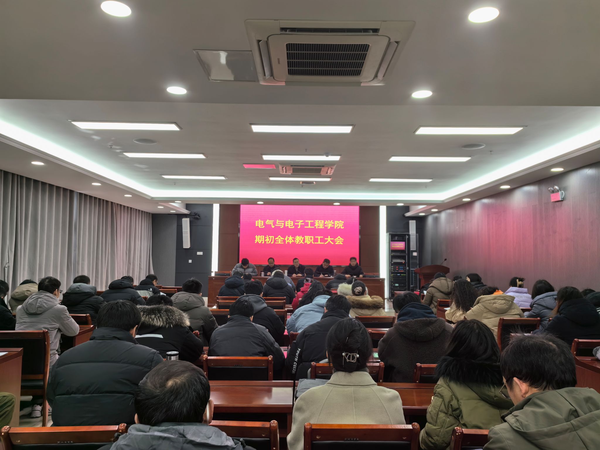 2月25日下午,电气与电子工程学院于西辅楼111会议室召开新学期全体教职工大会,学院党委书记骆海邦,党委副书记、院长夏显明,党委副书记、纪委书记尚磊,副院长国海,副院长樊晓宇及全体教职工参加了会议,会议由骆海邦主持。
