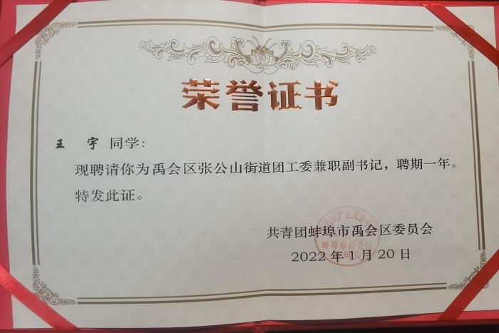 信中指出,王宇同学作为蚌埠籍大学生,能够主动请缨,积极响应号召,在家乡街道任职,在实践中锻炼自我,荣膺担当;思想开路,实干架桥,践行新时代大学生的理想与担当,能够在平日工作里以谦逊平和、踏实肯干的态度去了解群众,运用所学所思去帮助解决居民群众的实际问题,充分展现了华体平台学子的奕奕风采。