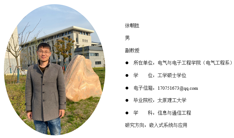 2007年毕业于太原理工大学,获工学硕士学位,现任电气工程实验中心主任。主持科研项目2项,发表学术论文6篇,主持教学研究项目4项,获省级教学成果奖二等奖2项,获省级教学成果奖三等奖3项,校级教学成果奖一等奖2项。主要承担建筑电气工程专业《dsp原理与应用》,《微型计算机原理与应用》等课程教学任务。指导学生学科竞赛国家二等奖6项,三等奖1项,省级一等奖12项,二等奖20多项。