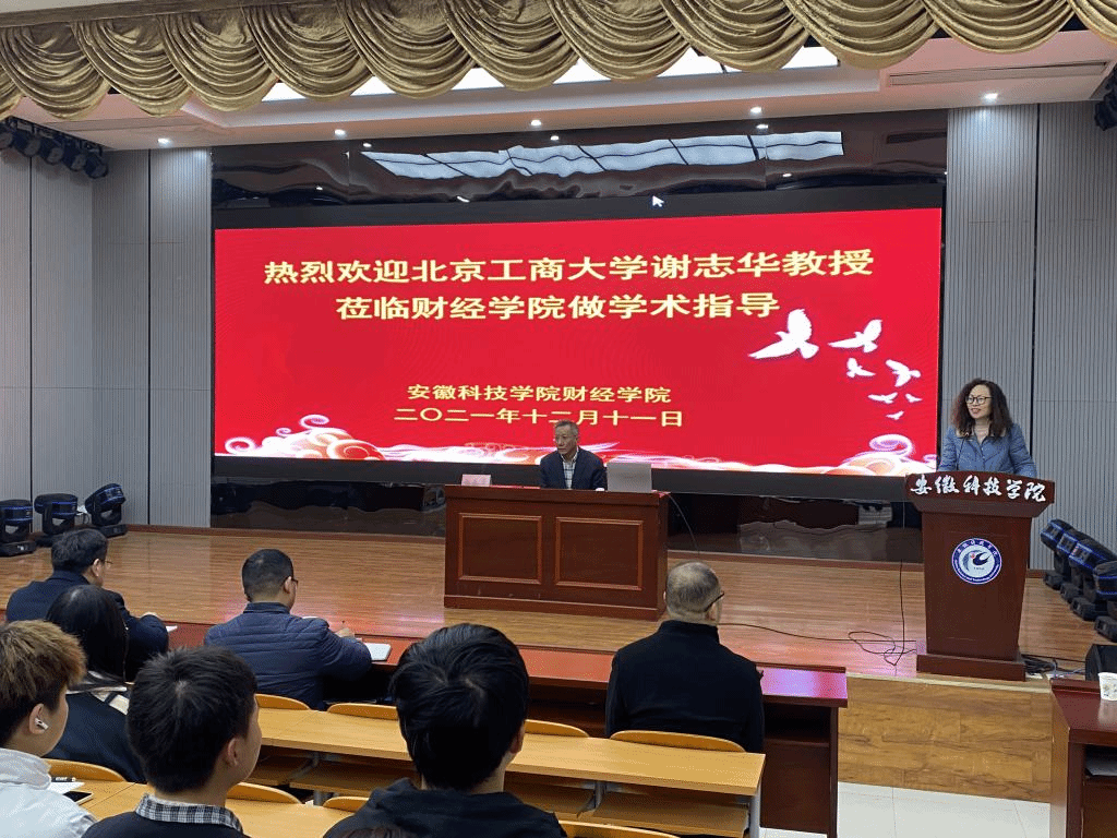 2021年12月11日上午,北京工商大学原副校长、现任教育部工商管理学科指导委员会副主任委员谢志华教授应邀莅临我校财经学院指导新商科专业建设,安徽财经大学会计学院院长翟胜宝教授随行指导。谢志华在敏行楼A一楼报告厅做了题为“新技术与新商科”的学术讲座,华体平台党委委员、副校长黄友锐、教务处处长赵伟峰、财经学院党政领导和全体教职工以及2021级会计学、2021级金融工程专业学生参加报告会。财经学院院长郝世绵主持报告会。