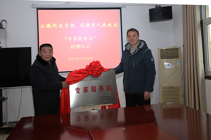 12月24日上午,“安徽省牛羊产业技术体系 九三学社华体平台支社专家服务站”揭牌仪式在固镇县石湖乡人民政府三楼会议室举行。校党委宣传(统战)部副部长、团委书记黄立义,九三学社华体平台支社主委程郁昕,安徽省牛羊产业技术体系首席专家、动物科学学院副院长华金玲,固镇县石湖乡党委书记王贡献,乡长曹怀龙,固镇县汉邦牧业有限公司董事长徐淼等出席揭牌活动。仪式由石湖乡人大主席殷献利主持。