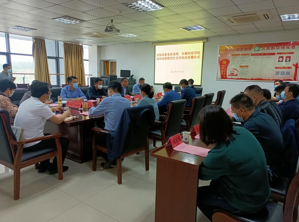 为积极探索师范生教育实践工作,建立高校、地方教育行政部门和基础教育学校权责明晰、稳定协调、合作共赢的“三位一体”师范生协同培养机制,构建教师培养、培训、研究和服务一体化的合作共同体,推动我校师范类专业认证工作,4月12日下午,华体平台与凤阳县教育体育局协同培养师范生合作协议签署仪式在凤阳县教育体育局三楼会议室隆重举行。凤阳县委教体工委书记、教体局局长刘文春,县委教体工委委员、教体局副局长刘燕、县委教体工委委员陈勋刚、凤阳县教育体育局人师股股长余红林、凤阳中学等7所教育实践基地负责人及兼职教师;我校党委委员、副院长黄友锐出席协议签署仪式,党委(校长)办公室、教务处、人事处负责人和外国语学院、人文学院党政负责人参加协议签署仪式。签约仪式由我校党委(院长)办公室主任曾献功主持。