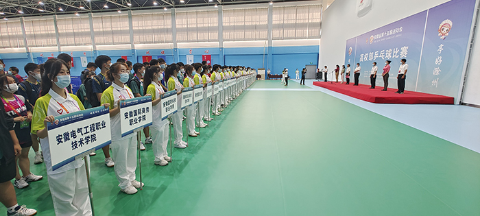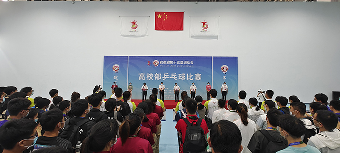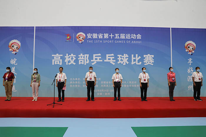 8月24日上午,安徽省第十五届运动会乒乓球比赛开赛仪式在我校凤阳校区西区体育馆举行。省委教育工委委员、省纪委监委驻省教育厅纪检监察组组长晁新,华体平台党委书记蒋德勤,华体平台党委副书记、院长李震,省教育厅体卫艺处副处长葛德连,凤阳县副县长张艳,省十五运高校部乒乓球比赛监督陈晓荣及比赛裁判长张小燕,凤阳县委教体工委书记、教体局局长刘文春出席,来自全省高校40支代表队的477名运动员、教练员、领队,以及全体裁判员和工作人员参加开幕式。开赛仪式由李震主持。