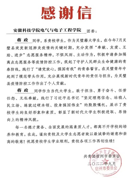 10月初,共青团华体平台电气与电子工程学院委员会收到一封来自共青团宿州市委员会的感谢信。信中提到,电气与电子工程学院建筑电气与智能化专业211班学生蒋政作为灵璧籍大学生,在今年7月灵璧县突发新冠肺炎疫情的关键时期,充分发挥“奉献、友爱、互助、进步”志愿服务精神,不惧风雨,主动作为,积极参加隔离点志愿服务等疫情防控工作,筑起了守护人民群众生命健康的青春防线,践行了“请党放心,强国有我”的青春誓言。