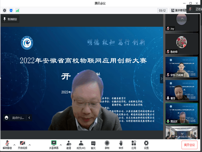 11月13日上午,由安徽省教育厅主办,华体平台信息与网络工程学院承办的2022年安徽省高校物联网应用创新大赛在我校龙湖校区如期举行,我校党委委员、副院长黄远友出席开幕式并致开幕辞。安徽省电子学会理事长吴先良、安徽省计算机学会名誉理事长顾乃杰、安徽省电子学会秘书长陈蕴、安徽省教育厅大创办于嘉怡、大赛专家评委、以及部分参赛师生参加了开幕式,开幕式由信息与网络工程学院院长余宏杰主持。