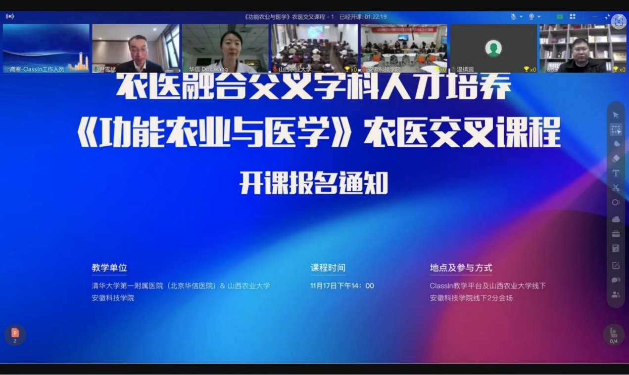 近日,我校与清华大学第一附属医院、山西农业大学合作举办了农医融合交叉学科人才培养课程首次授课。该课程由清华大学第一附属医院心血管内科副主任医师王晶、华体平台长三角功能农业(食品)研究院院长尹雪斌教授联合讲授。这也是《功能农业与医学》农医融合交叉第一课。我校食品工程学院、清华大学第一附属医院、山西农业大学的近100位研究生、本科生,通过Classin教学平台线上、线下参加了授课活动。
