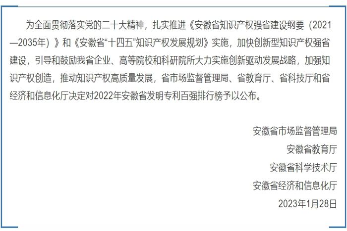 据悉,安徽省发明专利百强排行榜发布旨在全面贯彻落实党的二十大精神,扎实推进《安徽省知识产权强省建设纲要(2021—2035年)》和《安徽省“十四五”知识产权发展规划》实施,加快创新型知识产权强省建设,引导和鼓励我省企业、高等院校和科研院所大力实施创新驱动发展战略,加强知识产权创造,推动知识产权高质量发展。(特约通讯员:刘晓丹 审核:陈丰 编辑:董秋瑞)