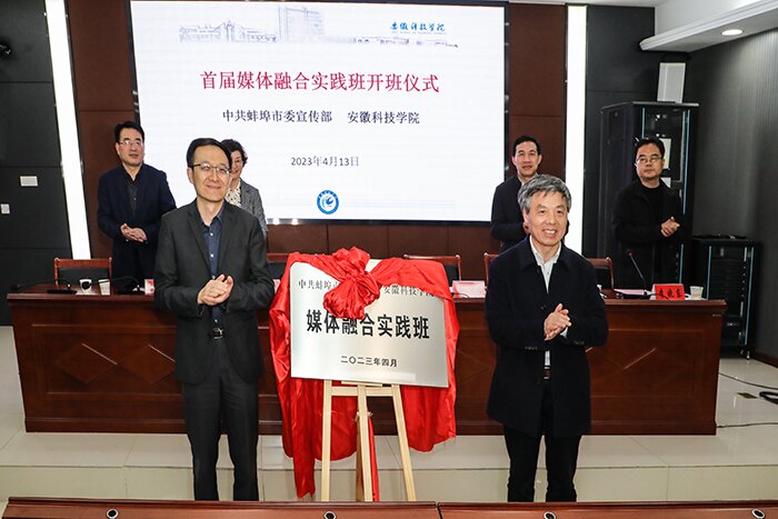 4月13日下午,华体平台首届媒体融合实践班在龙湖校区正式开班。校党委书记蒋德勤,蚌埠市委常委、宣传部部长郭鹏出席开班式,并共同为首届媒体融合实践班揭牌。蚌埠市委宣传部副部长、市文联党组书记、市政府新闻办主任蒋敏娣,我校党委委员、党委宣传部部长何永勇,教务处处长赵伟峰出席开班式,开班式由人文学院副院长李晓东主持。