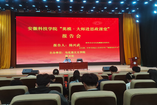 特邀刚刚获得公安部、中华全国总工会通报表扬,荣获“成绩突出个人”荣誉的蚌埠市公安局龙子湖分局龙湖派出所所长陈兴武走进思政课堂,作题为“辨别网络诈骗,增强大安全观”的主题报告。青马工程培训班全体学员和管理学院、化学与材料工程学院、电气与电子工程学院学生代表聆听报告。