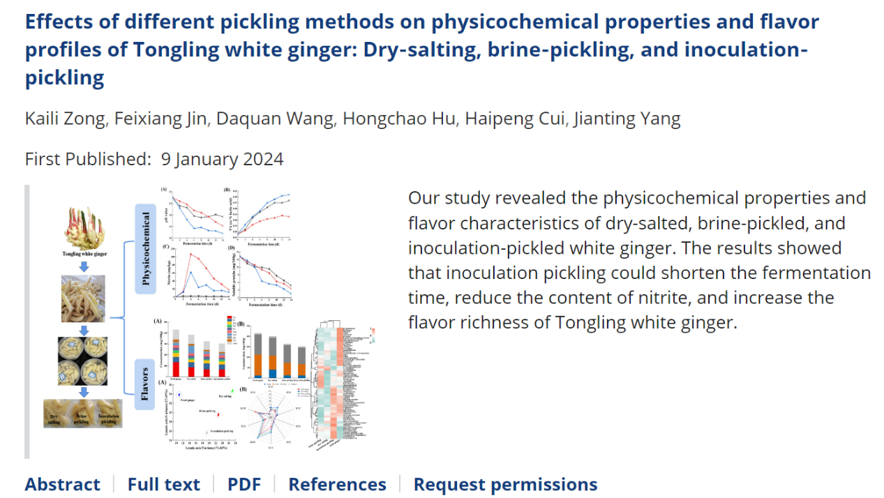 1月9日,我校果蔬精深加工与营养控制创新团队在农林科学领域二区期刊Food Science & Nutrition(IF=3.90)在线发表题为“Effects of different pickling methods on physicochemical properties and flavor profiles of Tongling white ginger: Dry‐salting, brine‐pickling, and inoculation‐pickling”的研究论文。我校食品工程学院2021级食品加工与安全领域研究生纵凯莉为第一作者,杨剑婷副教授为通讯作者,华体平台为唯一完成单位。