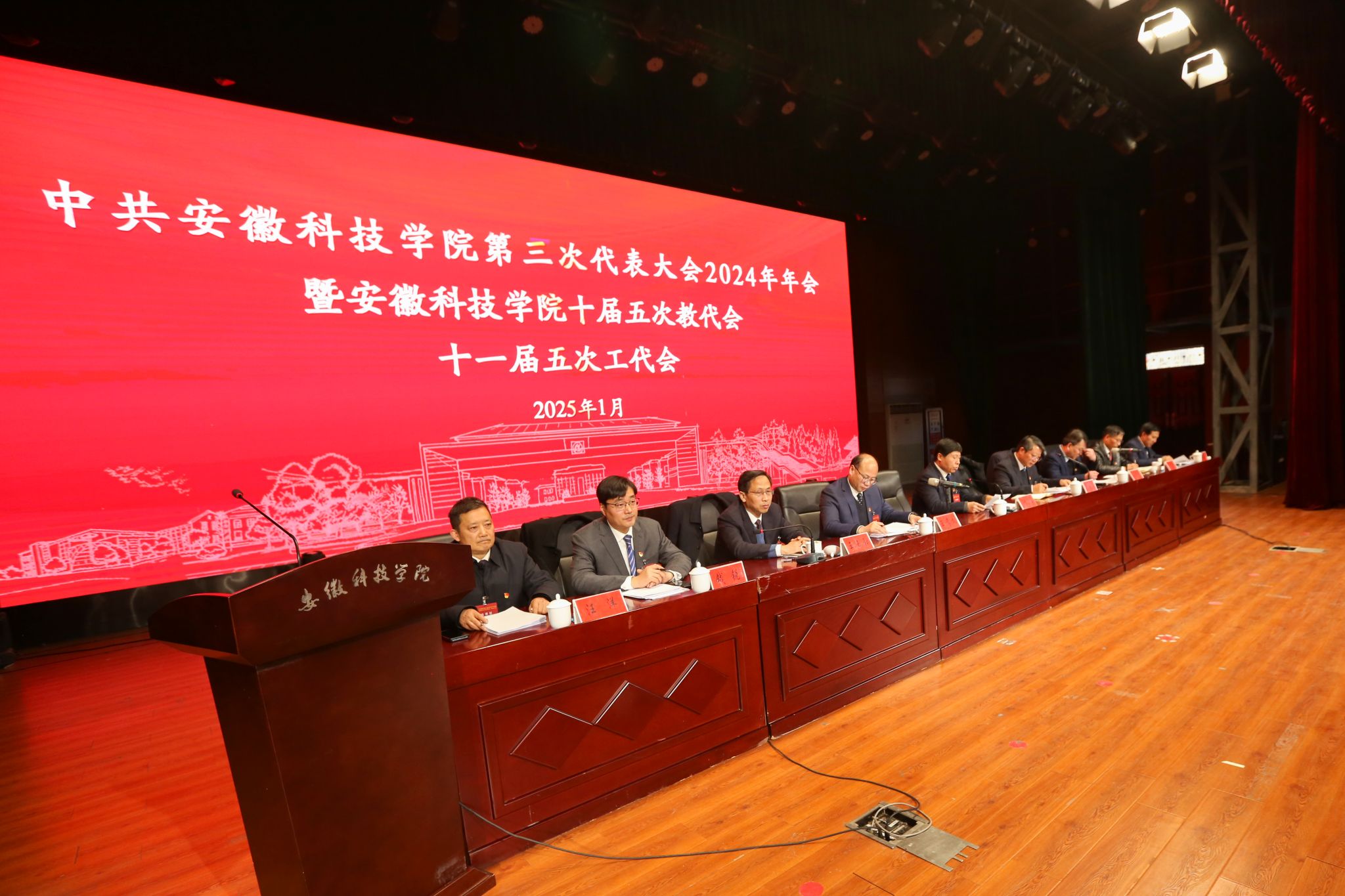 1月14日至15日,我校第三次党员代表大会2024年年会暨十届五次教代会、十一届五次工代会在凤阳校区大学生活动中心胜利召开。校党委书记时伟,党委副书记、院长李升和,党委委员、副院长王孝义,党委委员、副院长赵伟峰,党委委员、副院长王玉和,党委委员、机关党委书记卫胜,党委委员、党委组织部部长钱锐,党委委员、党委宣传(统战)部部长何永勇,校工会主席汪洋出席大会并在主席台就座。全体代表、列席人员和特邀人员参加大会。