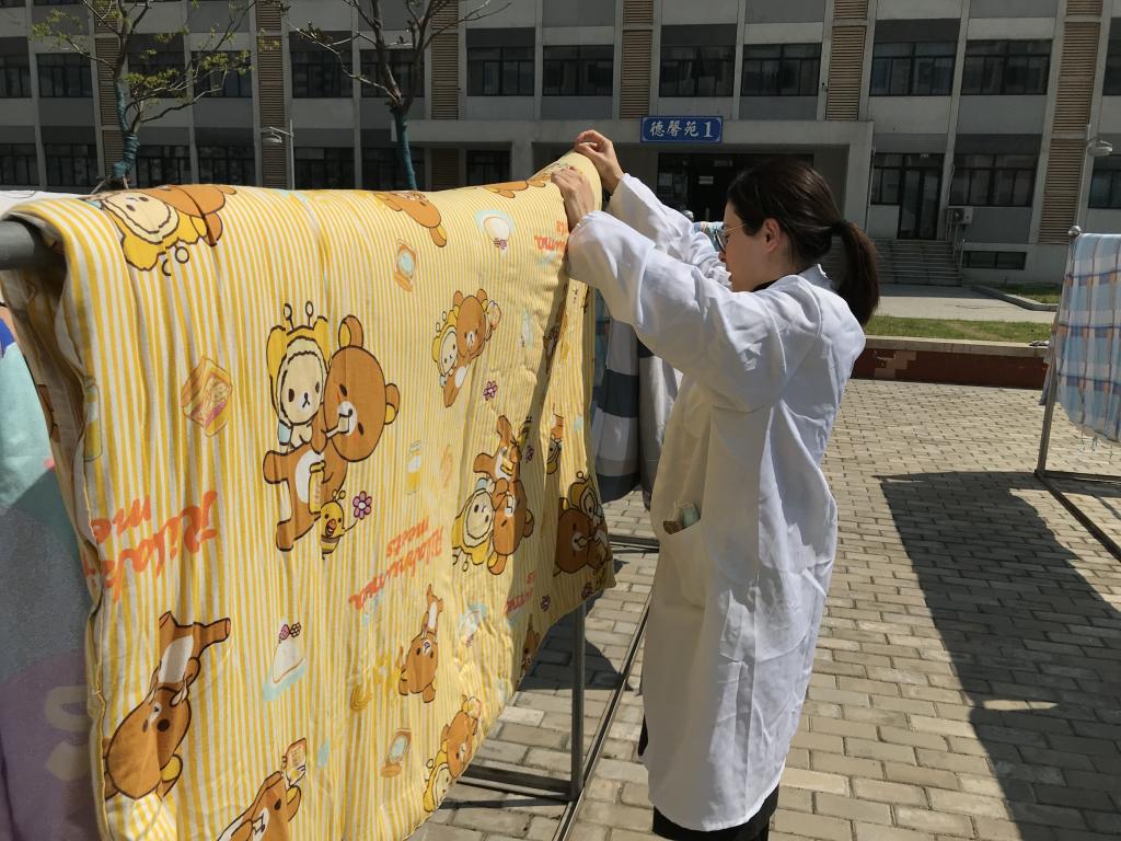 “老师,宿舍几个月没有通风了,被子都该长蘑菇了,怎么办啊?”“老师,我们宿舍在阴面,平时就潮,被子上应该有很多霉菌了,呜呜呜……” 这个特殊的寒假,学生们纷纷牵挂起自己的寝室,特别是几个月没有晾晒过的被褥。学院早已考虑到了学生们的需求,组织开展了线上下单,线下被“宠”服务。通知下发一天,学院就接到了95份“晒被订单”,并于4月24日和28日组织辅导员和教工党员志愿者组成多个晒被小分队,在公寓管理服务中心领导和员工的协助下,分组进入宿舍楼,将学生的被褥做上标记拿到楼下晾晒区进行晾晒,同时还为学生寝室通风透气,浇灌绿植,并将腐败的垃圾进行清除。