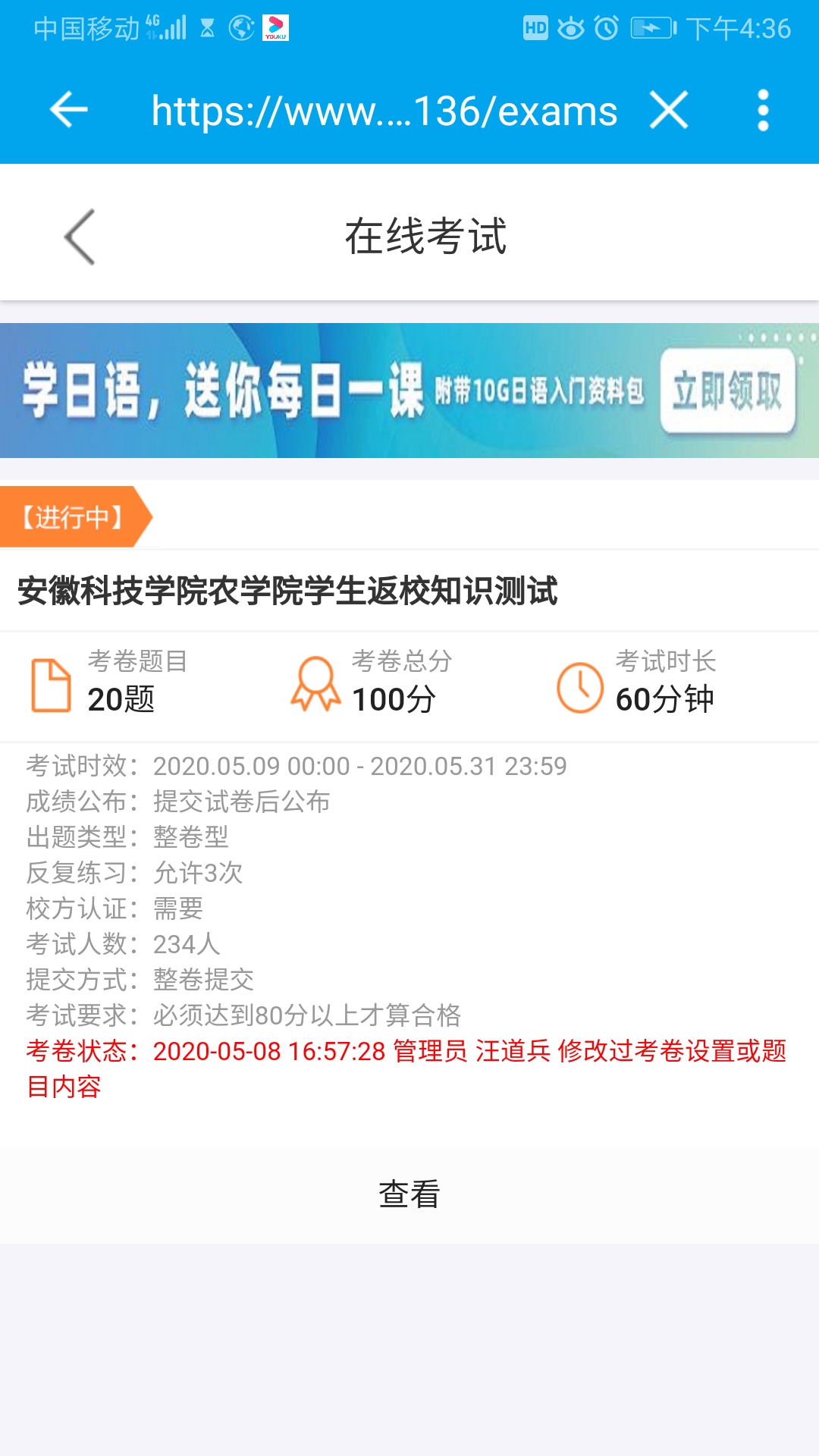 生命高于一切,安全重于泰山。截至目前为止,农学院已有234名返校毕业生进行了线上测试。通过此次测试,让广大农学学子对返校前后所注意的事项、要求及防控知识有了更加深入的了解和认识,保障了农学院2020届返校后的毕业生安全有序地学习与生活,进一步巩固了我校疫情防控工作的成效。(特约通讯员:张轶辉 审核:沈树周 编辑:汤帅)