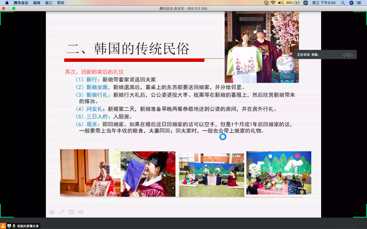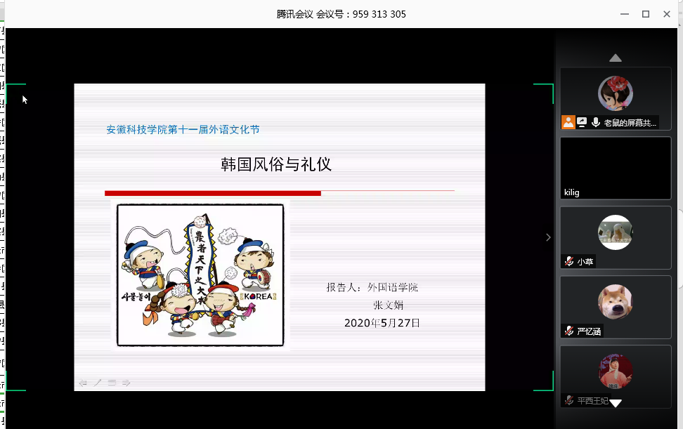为丰富学生校园文化生活,拓宽学生对外国民族风情的了解和认识,外国语学院于5月27日下午,利用腾讯会议在线举办了“英博杯”华体平台第十一届外语文化节之韩国风情讲座。本次讲座特邀外国语学院张文娟老师担任主讲人,外国语学院党总支书记蔡为青,专职辅导员宋兵兵出席,学院18、19级约200余学生共同参加,此次讲座由宋兵兵主持。