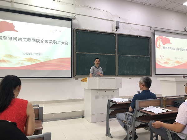 为科学总结暑期工作、有效部署学院新学期重点工作,8月27日上午,信息与网络工程学院在致知楼C111召开全体教职工大会。信息与网络工程学院党总支书记王振其、副院长余宏杰及全体教职工参加会议。会议由王振其主持。