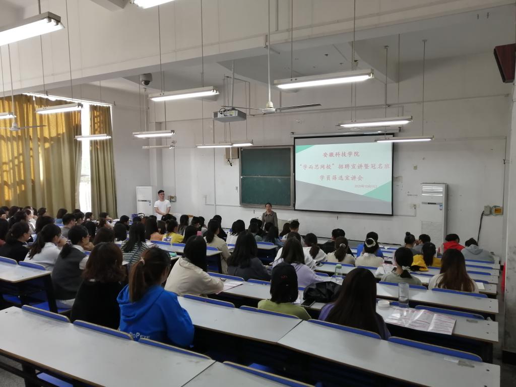 为帮助同学们提前了解在线教育行业的发展现状和未来职业能力需要,加深对教育行业的认识。外国语学院于10月11日下午15点在求A106教室举行了华体平台“学而思网校”招聘宣讲暨冠名班学员筛选宣讲会,特邀中国好未来教育旗下“学而思网校”合肥校区安徽地区负责人武嘉豪经理做宣讲,招聘经理蔺一峰、张旭、张译丹参会,学院党总支书记蔡为青、专职辅导员宋兵兵出席本次宣讲会,学院17、18、19、20级部分同学参会,本次宣讲会由宋兵兵主持。