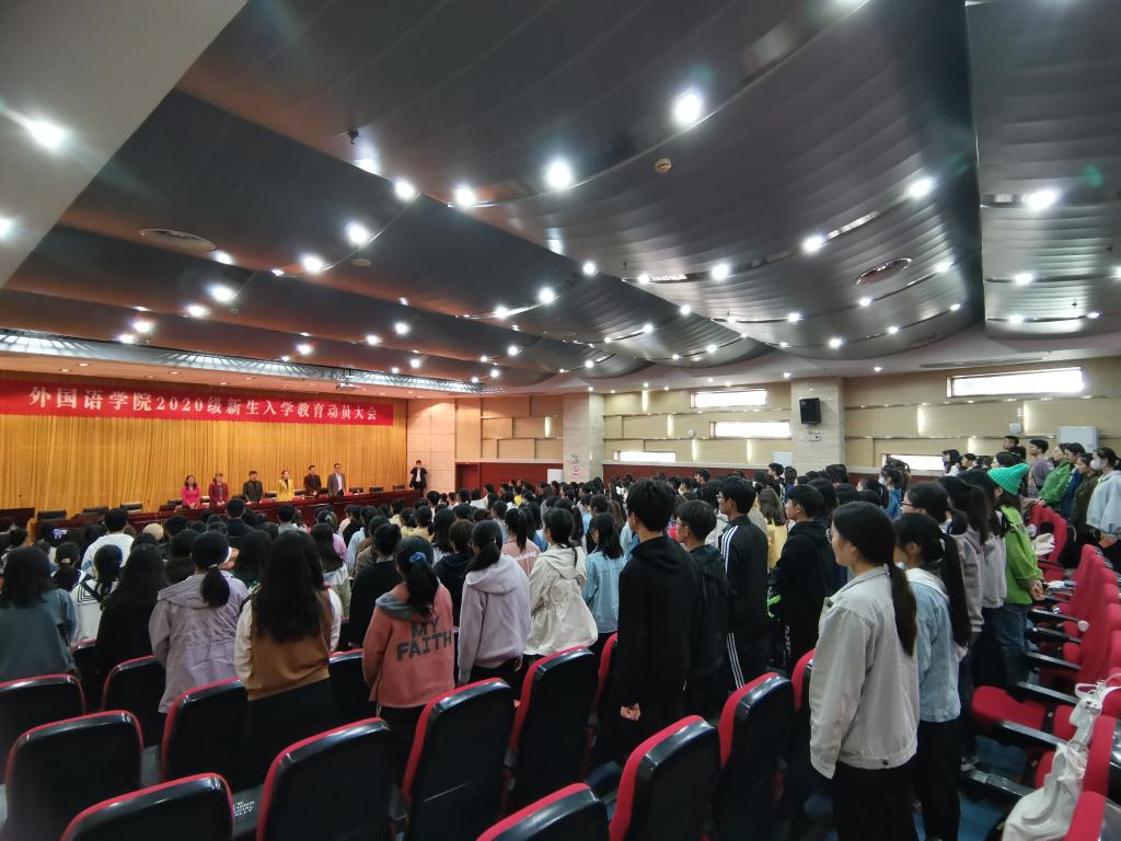 丹桂飘香,金秋送爽。20级新生带着青春的活力,带着对知识的不懈追求,带着对大学校园生活的无限憧憬,迈进了华体平台外国语学院。为了让新生更快适应新环境,适应新的生活,顺利、平稳、有效地进入大学生活。10月21日下午14:00,外国语学院在新图书馆第二报告厅举行了新生入学教育动员大会。外国语学院院长陈德用、党总支书记蔡为青、副院长刘萍、教学秘书周海平、英语专业教研室主任兼英语专业负责人洪民老师、翻译专业教研室主任兼翻译专业负责人邓兆红老师、分团委书记陈慧中、专职辅导员宋兵兵,学院教师代表,全体20级新生参会,大会由刘萍主持。