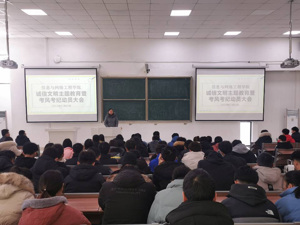 为进一步提高大学生的诚信文明素养,加强考风考纪教育,12月30中午,信息与网络工程学院于致知楼A111召开诚信文明主题教育暨考风考纪动员大会。学院副处级辅导员韦乃学,专职辅导员王培培、陈凯、李军成、崔北坤以及20级各班学生干部参加会议,会议由王培培主持。