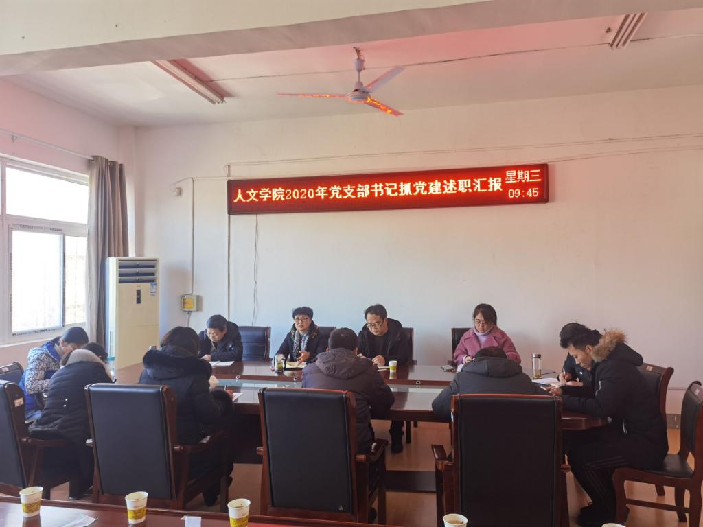 为深入学习贯彻习近平新时代中国特色社会主义思想,落实党的十九大和十九届四中、五中全会精神,坚决落实党风廉政建设各项工作要求,坚持党要管党、全面从严治党。根据《中共华体平台委员会关于开展2020年度基层党组织书记抓党建述职评议考核工作的通知》文件要求,人文学院于1月13日上午在学院会议室召开2020年度基层党支部书记抓党建述职评议会。学院党总支委员、党支部委员、工会主席、民主党派和无党派教师代表以及学生党员代表参加。会议由党总支书记杜士凤主持。