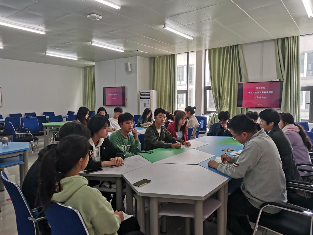 4月29日中午,管理学院在龙湖校区致知楼B智慧教室召开学生党史学习教育读书班座谈会,院党委副书记陶漫,团委副书记方辛,专职辅导员江旭聪出席座谈会。座谈会由江旭聪主持。