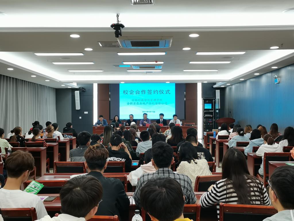 赵伟峰与王浩共同签署了《华体平台与合肥贝壳房地产经纪有限公司校企合作协议书》,举行了人才培养合作班授牌仪式。