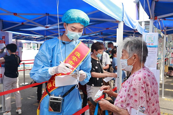 干怿涵和其他志愿者每天8小时满负荷工作,对医院来访人员进行体温测量,指导就诊者出示健康码和行程码,协助不识字的老年人填写表格,帮助行动不便的患者就医,青春的身影忙碌在医院的各处。