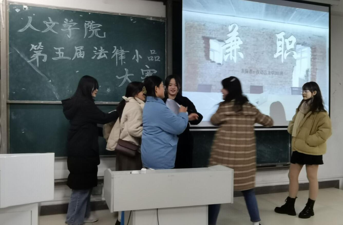 为反映法律文明建设,展现法律人的独特魅力。12月1日晚,人文学院于新知楼A102教室举办第五届法律小品大赛。本次比赛邀请了菁英主持社社长尹云庆、国风汉服社社长欧阳结龙、校广播台王雅杰、人文学院青年志愿者协会会长许晴担任评委。比赛由梅静怡主持。