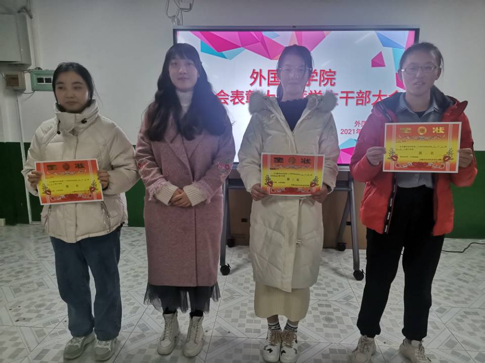 在干部大会上,陈慧中、宋兵兵、张薇薇分别布置了各自分管的工作,如:奖学金使用管理、安科E创项目申报、安全稳定、疫情防控、学风建设、意识形态、外语文化节闭幕式晚会、学籍异动等内容。在表彰会议上,与会老师们为获奖运动员颁发奖状并合影留念。宋兵兵宣读了《外国语学院学生在华体平台第30届运动会的通报表扬名单》,张薇薇宣读《外国语学院在校第30届运动会中获奖运动员名单》,院学生会执行主席桂纪昌对本次校运动会进行了总结发言。