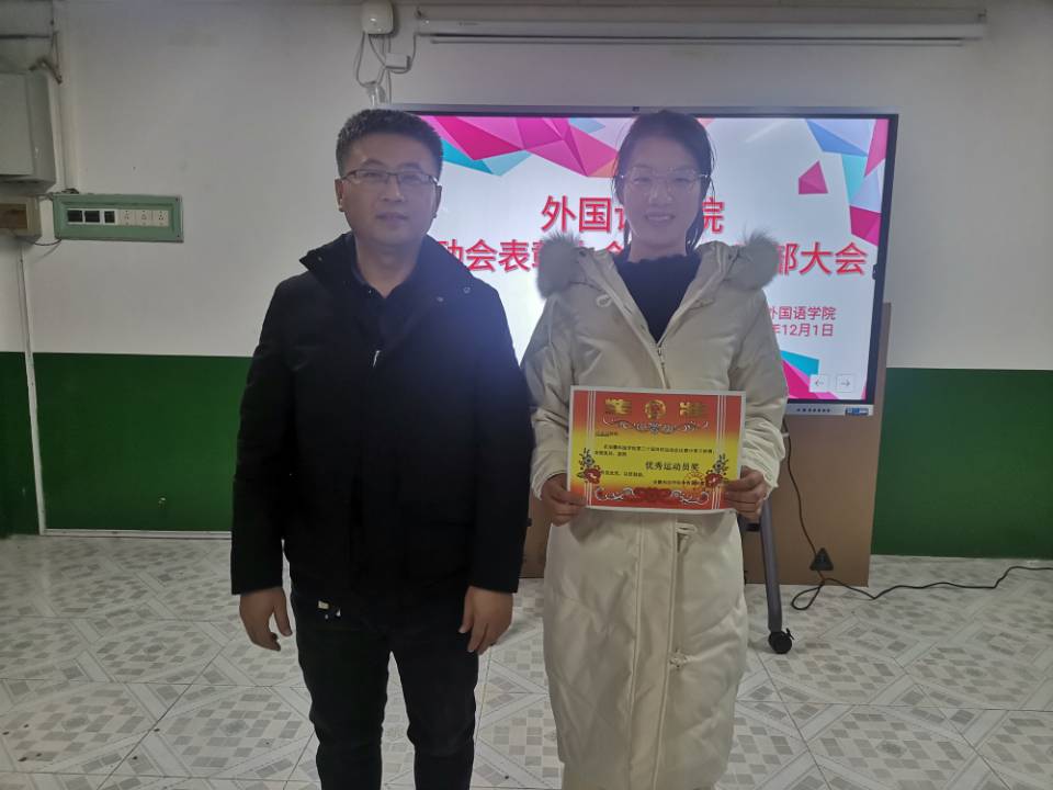 在干部大会上,陈慧中、宋兵兵、张薇薇分别布置了各自分管的工作,如:奖学金使用管理、安科E创项目申报、安全稳定、疫情防控、学风建设、意识形态、外语文化节闭幕式晚会、学籍异动等内容。在表彰会议上,与会老师们为获奖运动员颁发奖状并合影留念。宋兵兵宣读了《外国语学院学生在华体平台第30届运动会的通报表扬名单》,张薇薇宣读《外国语学院在校第30届运动会中获奖运动员名单》,院学生会执行主席桂纪昌对本次校运动会进行了总结发言。