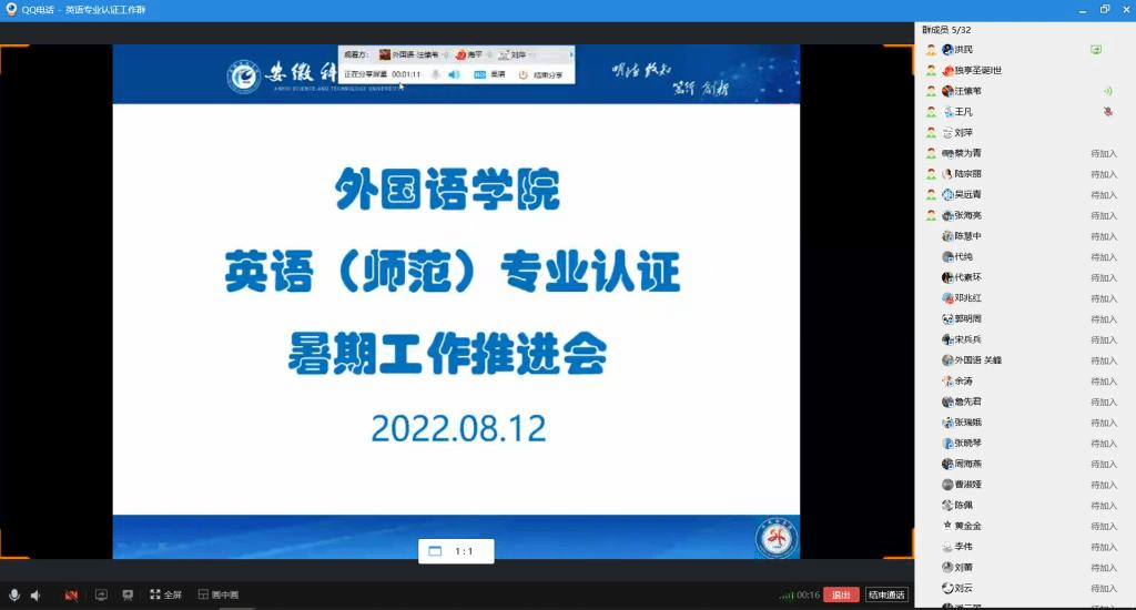 为推进英语(师范)专业认证工作,8月12日下午,外国语学院通过QQ群召开了暑期第三次组长推进会。学院党政领导及专业认证小组组长参会,会议由外国语学院副院长洪民主持。