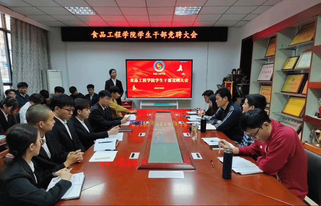 为进一步加强团学组织学生干部队伍建设,选拔出作风优良、能力过硬、奋发有为的学生干部。10月23日下午,食品工程学院在会议室开展了院团委、学生会主要学生干部竞聘工作。学院党委书记付光玺到会指导并讲话。党委副书记、纪委书记王广良,团委书记赵传磊和专职辅导员吴玘、程韬与团学组织主要负责人组成工作小组,参加本次面试工作。共39位同学参与竞聘,会议由吴玘主持。