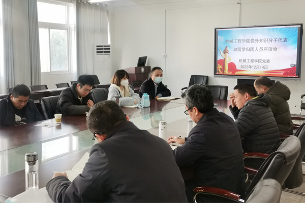 为深入学习宣传贯彻党的二十大精神,结合开展2022年度党外知识分子“双树双建”主题教育,团结凝聚党外知识分子和留学归国人员力量,持续推进学院各项重点工作,2022年12月14日下午,机械工程学院在笃行楼409会议室召开党外知识分子代表和留学归国人员座谈会。会议由学院党委书记胡振江主持,正处级组织员张严政,党委委员、副院长张华、乔印虎,来自九三学社、民进党、中国农工民主党的魏宝丽、张新伟、杨拓宇、查文可,留学归国人员张雅晶、董文彬、余振、石文可、卢亦彤等9位老师参加座谈会。
