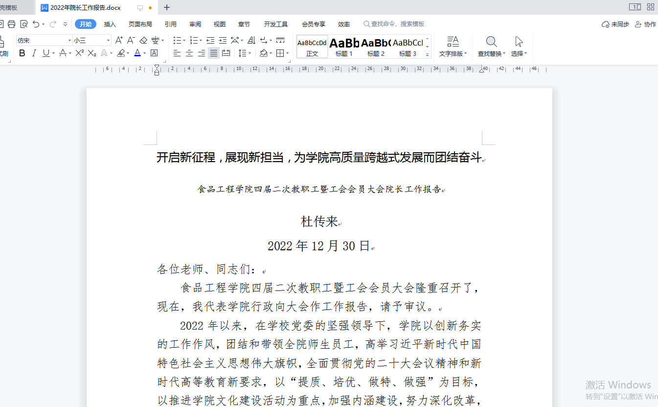 杜传来代表学院行政向大会作了题为《开启新征程,展现新担当,为学院高质量跨越式发展而团结奋斗》的工作报告。他指出,2022年在学校党委的坚强领导下,学院以创新务实的作风,高举习近平新时代中国特色社会主义思想伟大旗帜,全面贯彻党的二十大精神和新时代高等教育新要求,以“提质、培优、做特、做强”为目标,以推进学院文化建设活动为重点,加强内涵建设,努力深化改革,围绕教育教学、科研、学科建设、专业建设、师资队伍建设等中心工作,以人为本,规范管理,优质高效地开展各项工作,各方面工作取得新的进步和发展。他强调,在看到成绩的同时,也要正视学院在教学改革、师资队伍结构、学科团队水平、学科平台层次、学科方向和专业特色等方面存在的不足与差距,并提出了2023年主要工作思路。
