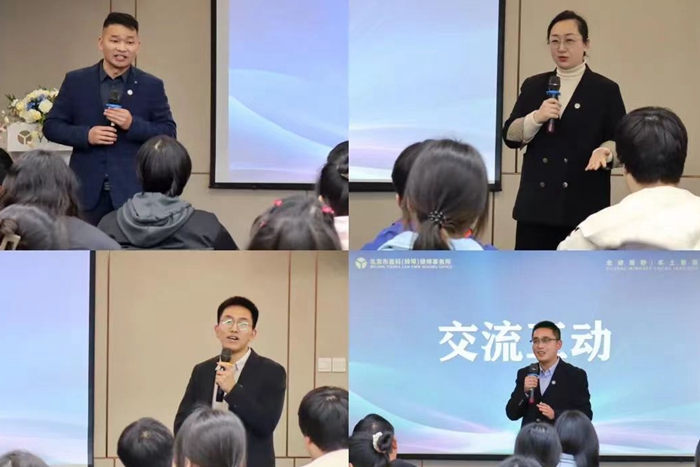 在交流分享环节,盈科蚌埠人才战略委员会主任李德律师、盈科合肥名誉合伙人周虎律师、青年律师曹滢、实习律师孙天宝、丁杰,分别结合自身成长经验和执业经历,与同学们进行了分享和互动;他们指出,法学生要有职业目标和方向,做好职业规划,趁年轻、趁现在、珍惜时间,潜心读书。