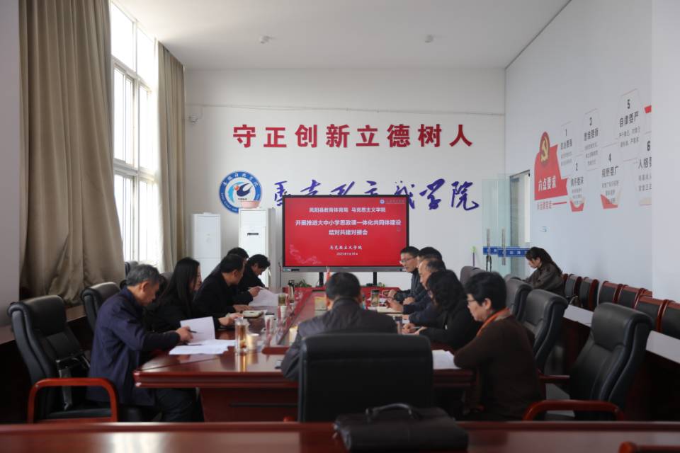 为深入贯彻落实党的二十大精神,全面推进大中小学思政教育一体化建设,充分发挥学校思政课立德树人关键课程作用,切实提升思政教育铸魂育人实效,3月30日上午,凤阳县委教体工委书记、教育体育局局长刘文春,教体工委副书记顾斌一行,来到华体平台马克思主义学院学术交流中心与我院开展推进大中小学思政课一体化共同体建设结对共建对接会。对接会由马克思主义学院党总支副书记、院长张德化主持,马克思主义学院党总支书记杨仕勇,副院长张栋等出席会议。