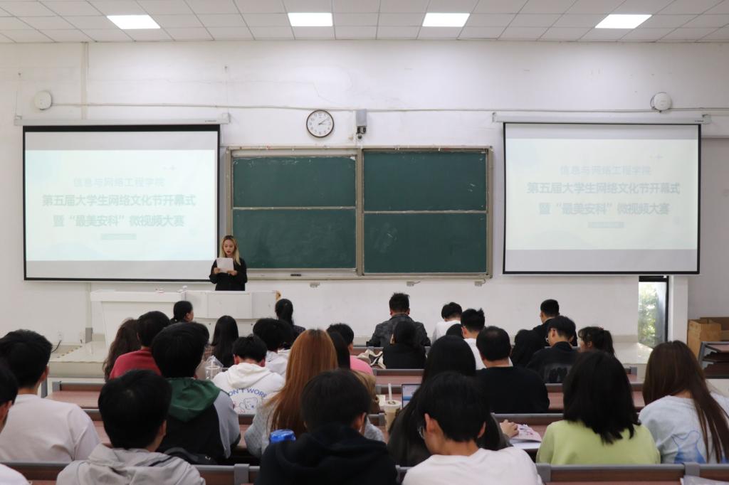 为促进广大学生积极参与网络文化建设,传递网络正能量。4月12日下午,信息与网络工程学院在致知楼C111举办第五届大学生网络文化节开幕式暨“最美安科”微视频大赛评选活动。信息与网络工程学院党委副书记、纪委书记韦乃学、专职辅导员李军成、丁阿敏、崔北坤、许磊出席开幕式,学院学生会全体成员、本场比赛的参赛者以及2022级主要学生干部参加开幕式。开幕式由学生会文体中心副主任王艺陶主持。