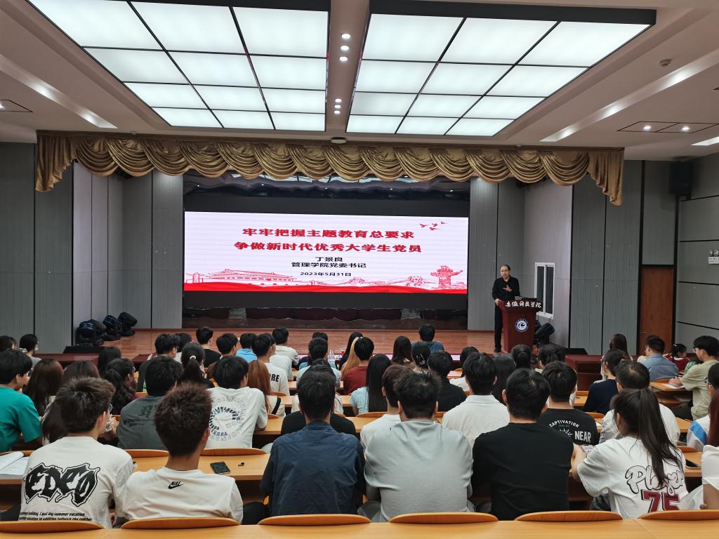 根据学院党委学习贯彻习近平新时代中国特色社会主义思想主题教育总体安排,5月31日晚,管理学院党委在敏行楼A演出厅组织开展“牢牢把握主题教育总要求,争做新时代优秀大学生”专题党课和观看红色影片主题党日活动,全体在校生党员和入党积极分子参加此活动。
